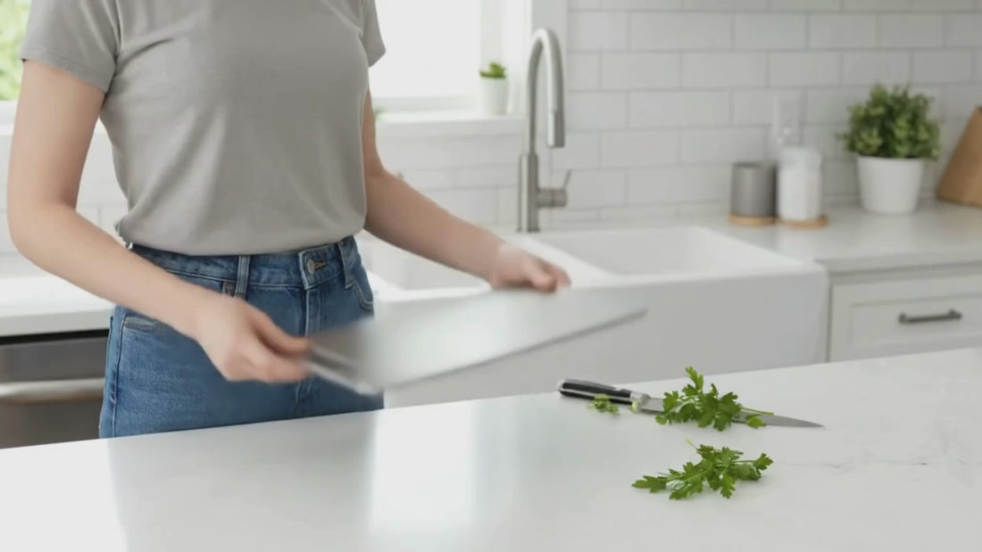 Kesme panomuzun üretiminde kullanılan 304 sertifikalı paslanmaz çelik, mutfak bıçaklarınızın büyük bir kısmının yapıldığı çelik türlerinden daha düşük bir sertlik seviyesine sahiptir. Bıçaklarınızın ağız kısmı (kesici kenar), panodan daha sert olduğu için, kesim sırasında panonun yüzeyi bıçağın keskinliğini koruyacak şekilde hafifçe "esner" veya aşınır. Bu özel denge, bıçakların körelme riskini minimuma indirir ve keskinliklerinin uzun süre korunmasını sağlar.